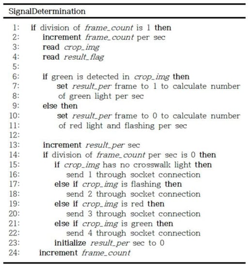 After the green or red color was identified, the next step was to check if it was safe for the client to cross at the crosswalk, as determined by another algorithm (Figure 3). The input images received from the Raspberry Pi were divided into 30 frames per second. The algorithm then read the crop_img extracted from each frame and result_flag indicated the crosswalk light. A green count of result_per would be implemented if the green color was identified in the image, and a red count of result_per would be implemented if the red color was identified. The result_per of this algorithm was determined from four types of lights: none, red light, green light, and flashing light. The result was then passed to the Raspberry Pi client using a transmission control protocol (TCP) socket connection to play the voice guidance.