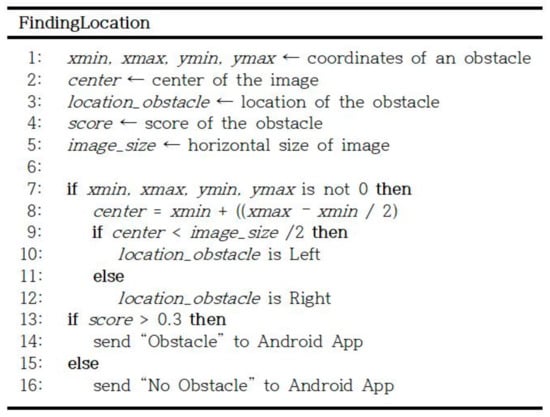 Figure 4 shows the algorithm for finding the location of an obstacle once an obstacle has been detected. Once the obstacle has been recognized, the coordinates can be obtained using the bounding box already added to the image. We could get xmin, xmax, ymin, and ymax, which indicated each vertex of the box. If any of the values were not 0 in an image, it meant that there was an obstacle. Therefore, the center, or the horizontal middle value of the box, could be obtained. If this center value was less than half of the total image size, location_obstacle was left; otherwise, it was right. The coordinates result was sent to the Android app to monitor the obstacle, but only when the threshold was above 0.3. By default, the Google Object Detection API was set to a threshold of 0.2, so it would recognize an object and draw a box only if the score was greater than 0.2. We used a threshold value of 0.3 because the default threshold was too low to recognize obstacles. It could be considered that an obstacle was typically recognized only when the recognition score of the Google Object Detection API was 0.3 or higher.