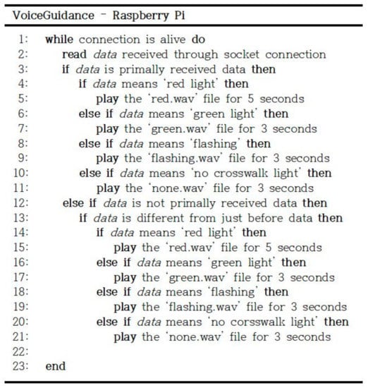 The results processed by the server were delivered to assist the client immediately. Figure 5 shows how each case is handled from previous recognition results from the server, where 1 is for no crosswalk light, 2 is for a flashing light, 3 is for a red light, and 4 is for a green light. If the same result was received by the client, the voice guidance would not be played because it could be considered that the traffic signal had not yet changed. The voice guidance played only when the receiving result changed. For example, if the red result was received, and then the green result was received, a client could play “green.wav.”