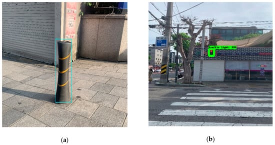 This section describes the results of the display screens when recognizing crosswalk lights or bollards. Figure 6 shows the moments of recognition for two different obstacles. Figure 6a shows a screen that recognizes a bollard, while Figure 6b shows a screen that recognizes a crosswalk light. Both the bollard and crosswalk light were from verification data taken elsewhere and not from the images used for training. Each image that was sent by the Raspberry Pi camera module was successfully recognized in real time by the server. The obstacle then appeared in the bounding box. In addition, the position of the obstacles could be determined by the coordinate values.
