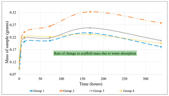 Group 1 showed a 155.10% swelling, Group 2 showed 165.95% swelling, Group 3 showed 160.93% swelling, and Group 4 showed 146.75% swelling after 168 h of incubation with PBS. According to the data, Group 2’s hybrid hydrogels showed the highest rate of absorption indicated by the highest change in mass over time of incubation. The degradation rate of each sample was also measured by observing the change in mass of the samples after immersion in PBS over time. The pure alginate samples (Group 1), Group G, Group 3, and Group 4 showed 32.53%, 13.33%, 40.00%, and 19.70% degradation, respectively, over time incubated in PBS. PBS has been used widely to evaluate the degradation rate of scaffolds, as reported in References [11,28,29,30]. Notably, as future work, other solutions such as fetal bovine serum and penicillin-streptomycin contained medium can be used to check the degradation rate of scaffolds. The alginate-gelatin-MC and pure alginate gels showed the greatest rate of degradation. The compressive strength of all groups was determined by finding the elastic modulus of each sample over weekly intervals of time, and the results are shown in Figure 3.