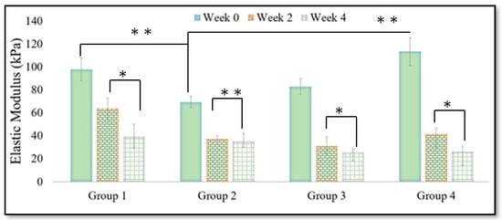 The elastic moduli of Group 1’s samples were 97.7 kPa, 63.8 kPa, and 39.1 kPa, while for Group 2’s samples, it was 69.4 kPa, 37.1 kPa, and 35.2 kPa during the 0, 2, and 4 weeks of incubation in PBS, respectively. The values for Group 3’s samples were 82.85 kPa, 31 kPa, and 25.4 kPa, and the values for Group 4’s samples were 113.3 kPa, 41.45 kPa, and 26.1 kPa. The results indicated that there was a decline in the compressive strength of each of the hydrogels. This was especially evident in the first two weeks. After the first two weeks of immersion, the decline in compressive strength was more pronounced in pure alginate gels than the composite polymer samples. Furthermore, the scaffolds of Group 4 had a significantly higher elastic modulus compared to the hybrid constructs containing gelatin.