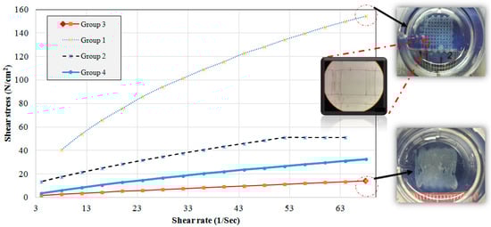 The flow behaviors of groups 1 to 4 were investigated at 37 °C. A Brookfield Ultra III Rheometer with the CP-41 spindle was used for the testing. The shear rate, shear stress, viscosity, and percentage of torque have been measured at various rotational speeds.