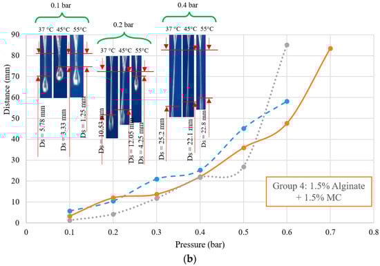 Air pressure is one of the most critical factors affecting printability [2]. Every biomaterial has surface tension and to print a biomaterial, a pressure more than the surface tension of the biomaterials should be applied. Figure 5 shows the effect of printing pressure on purging status of groups 2 and 4 at different temperatures, as an illustration. We defined Ds as the distance between the end of the needle and the position separated by the droplet of biomaterial. As such, for different biomaterials, Ds can be measured and to this end, suitable pressure and temperature can be selected. As shown, for some groups, even at 0.3 bar, the biomaterial was not printable and it was like a droplet hanging from the needle. On the other hand, higher pressures caused instability of extruded biomaterial, and subsequently, poor printability. Group 1 behaved like a highly viscous biomaterial and was not printable at 37 (0.2 bar). At higher pressures, Ds was between 4.8 to 25.8 mm and higher pressures showed higher Ds. Group 3 showed a non-viscous behavior and even at 0.2 bar pressure, Ds of more than 7.5 mm was observed. Our results showed that 0.2 bar was a suitable pressure to dominate the surface tension of biomaterials for groups 1, 2, and 4, while 0.1 bar was found to be more suitable for Group 3.
