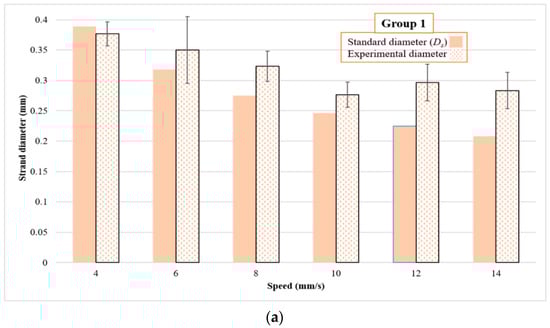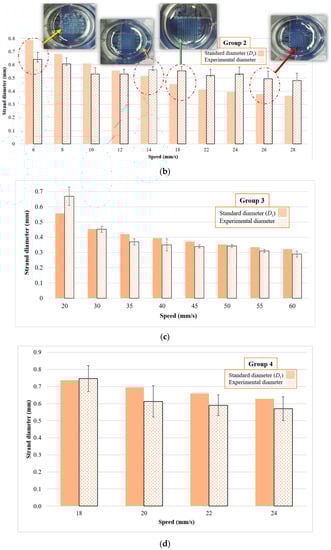 where , Q, and Ds are density, flow rate, and standard strand diameter, respectively. Here, different solutions for groups 1 to 4 were purged for a limited time, and then purged materials were weighted using the Sartorius Scale (model 225d). From Equation (1), the volume can be calculated and then using Equations (2) and (3), the flow rate and standard strand diameter can be calculated, respectively, for different nozzle speeds. For this evaluation, the pressure was maintained between 0.2 to 0.4 bar and the temperature was the same as the one reported in Section 2.7.2. Based on Equation (3), strand printability was defined as: