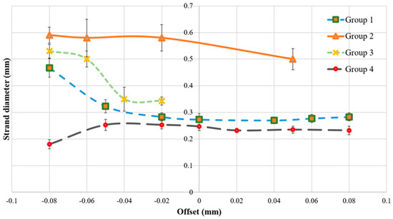 Effect of offset on the strand diameter of scaffolds made of Groups 1 to 4.