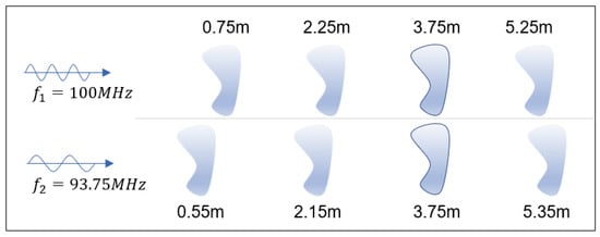 Another method that can be used to solve the 2π ambiguity problem is dual-frequency modulation. Dorrington et al. [24] used two different modulation frequencies to solve the measurement ambiguities. In this method, two measured distances are obtained for each modulation frequency sequentially using the AMCW method. The actual distance is then calculated using these two measured distances [24] as follows. Figure 2 shows the overall scheme when using these two modulation frequencies sequentially.