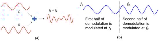 Schematic of simultaneous dual frequency modulation with sequential demodulation. (a) Superposition of two modulation frequencies to modulate the illumination source; (b) demodulation signal separated into two parts in sequence.
