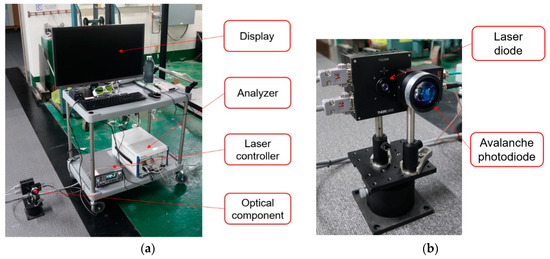 Figure 5a shows the whole distance measurement system. The distance measurement system consists of five components: a monitor for displaying the results of the experiment, an analyzer for computing all calculations in real time, a laser controller, a laser diode, and an avalanche photodiode. Figure 5b shows the optical components.