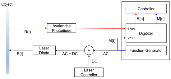 Figure 6 shows the overall signal flows of the measurement system. The laser controller generates a DC component for the signal, and the function generator generates a modulation signal. Part of the modulation signal is connected to one channel of the digitizer to be used as the demodulation signal. The remaining generated modulation signal is combined with the DC component of the laser controller and used to modulate the laser diode, which emits the optical signal onto the object. The emitted light signal is then reflected and detected by the avalanche photodiode, after which the avalanche photodiode transmits the measured voltage signal to the digitizer through another channel. The digitizer collects input signals and transmits them to the controller. The controller calculates the distance using the signals received. One distinct advantage of this system setup is that the modulation signal and demodulation signal can be generated using only one function generator.
