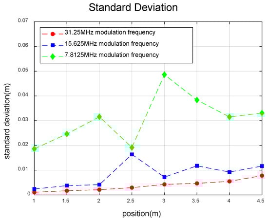 Figure 7 shows the results of the experiment for different modulation frequencies. The modulation frequencies were 31.25, 15.625, and 7.8125 MHz. The modulation voltage amplitude was fixed at 12 V. Figure 7 shows that as the modulation frequency increased, the standard deviation decreased, which can be described by Equation (10). For the case of 7.8125 MHz modulation frequency, the maximum value of the standard deviation was about 0.05 m. On the other hand, for 31.25 MHz modulation frequency, the maximum value of the standard deviation was lower than 0.01 m.