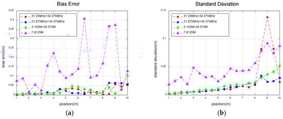 Figure 9a shows that the bias error when using only single low frequency is much larger than that when using dual frequencies. Specifically, the maximum value of bias error when using single low frequency is higher than 0.4 m. On the other hand, the maximum value of bias error for dual-frequency cases is about 0.1 m. Figure 9b shows that the standard deviation when using only single low frequency is much larger than that when using dual frequencies in general. It should be noted that as higher frequencies are combined, the standard deviation becomes smaller. This trend is also shown in earlier work [25]. However, in case of combination of 31.25 and 34.375 MHz, there is an abrupt increase in the standard deviation at around 9.0 m, which was predicted in Equations (27) and (28) [25]. Consequently, as shown in Figure 9b, the best combination of dual frequencies is the intermediate frequency and high frequency; i.e., 21.875 and 34.375 MHz.