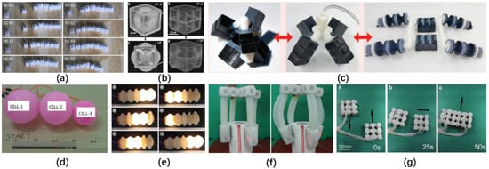 Modular reconfigurable robots (MRR) consist of several uniform modular units. Different relative positions between the modular units can form different robot structures, thereby realizing different motion forms and conducting variable tasks. Soft robots are made of soft material, such as silica gel, hydrogel, EAP, and SMP. They have infinite degrees of freedom due to the special characteristics of the soft material, which makes soft robots able to make continuous and large deformation beyond their own scale, and pass through narrow spaces smaller than their own scale. Increasingly, researchers have applied the concept of modularization to the field of soft robots since Onal and Rus [1,2] put forward soft modular robots for the first time. As the term suggests, soft modular reconfigurable robots hold the characteristics of both soft robots and modular reconfigurable robots. Figure 1a–g shows some classic prototypes of soft modular robots. For instance, Vergara et al. [2] simulated cell migration, delamination, involution, and even simple self-reconfiguration using a simple pneumatic cubic soft module. Morin et al. [3,4] designed a kind of pneumatic cubic which has six surfaces with different patterns and materials, so that different shapes can be formed when inflated and a variety of functions can be achieved when combining several cubic modules. By using the concept of assembling, Lee et al. [5] designed modules with different materials and functions that can be assembled to form the physical prototype according to the tasks’ requirements. In addition, there are many analogous designs, such as the multi-spherical modules [6], the soft modular robots actuated by voice coil [7], the reconfigurable bending modules [8], the reconfigurable omnidirectional soft robots [9], and so on.