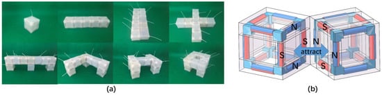 (a) Various configurations of soft modular robots. (b) The connection schematic of soft cubes.