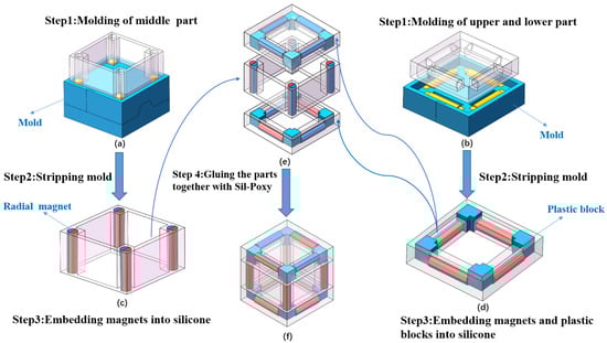 We designed and fabricated a soft cube with a simple structure as a basic unit of our soft modular robot, and the soft cube can be combined into various configurations, as shown in Figure 2. The fabrication process of the soft cube is illustrated in Figure 3a–f. The soft cube is casted with silica gel. We first created the 3D model of the mold in SOLIDWORKS and fabricated the mold by the 3D printer, then poured the mixture of A and B Ecoflex-50 silica gel into the mold, as shown in Figure 3a,b. The silica gel solidifies after about 4 h at ambient temperature, then we inserted the radial magnets lubricated with Vaseline into the cavity. The function of Vaseline is to ensure the magnets can rotate along the axis. When the two cubes approach each other, the magnets rotate to the polarities that attract each other and combine firmly. In addition, we also glued eight 3D printed plastic blocks to eight vertices of the cubes, as shown in Figure 3c,d. The rigid plastic blocks have two functions: one is to prevent the magnet from sliding out of the cavity when the cubes are inflated, and the other is to ensure that the actual cubes and the cubes in the simulation software are more consistent. One of the eight blocks in the cubes has an air inlet to introduce a 4 mm airline, and the top, middle, and bottom parts are glued together with the special adhesive for silica gel called SIL-POXY, as shown in Figure 3e. Then, the final model is obtained, as shown in Figure 3f.