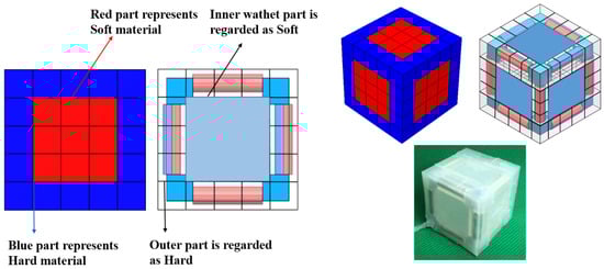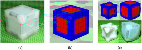 Previous researchers [22,28] put forward that computational requirements scale proportionally to the amount of voxels simulated, usually exponentially, increasing the computational power needed when more are used, and that a very precise physical model may not be required for the purpose of gait optimization. Therefore, we wanted to use as few voxels as possible to construct our soft robot model to ensure computational efficiency, though of course under the premise that the appearance and deformation are almost consistent with the actual soft cube, as shown in Figure 4. The blue voxels represent rigid materials, and the red voxels represent soft materials. These voxels are linear-elastic, and their physical parameters, such as density and modulus of elasticity, can be modified.
