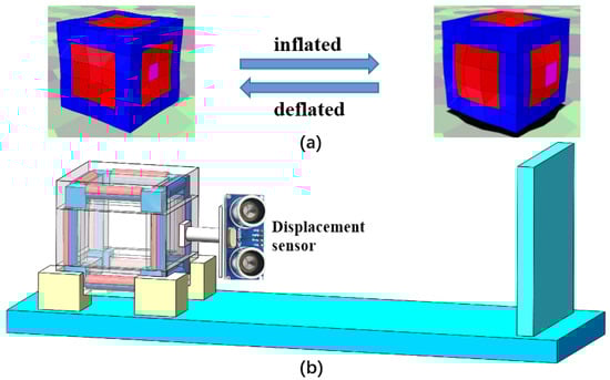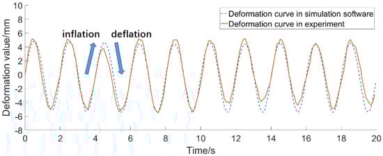 Meanwhile, we measured and compared the deformation of the soft cube during inflation and deflation. Since the deformation of the soft cube is symmetrical, we used the deformation value of one of the surfaces to represent the deformation of the entire soft cube. As shown in Figure 6a, the central pink voxel of the side surface is selected in the simulation software, and its displacement in the direction perpendicular to the surface represents the deformation value of the soft cube, and the displacement can be exported by VOXCAD. As shown in Figure 6b, we used the ultrasonic displacement sensor to measure the deformation of the side surface of the soft cube. The soft cube is attached to four yellow support blocks that can slide freely on the experiment table. The function of the support blocks is to prevent the soft cube from toppling when the bottom surface expands. The ultrasonic sensor is connected with the surface to be measured, and when the soft cube is inflated and deflated, the distance variation between the ultrasonic displacement sensor and the obstacle can be equivalent to the deformation of the surface. We managed to make the deformations in the simulation software and experiment of the soft cube as concordant as possible by adjusting the parameters in the simulation software and the pressure outputted by air pumps, and the final result is shown in Figure 7. In order to quantitatively represent the error between the simulation curve and the experiment curve, we selected 2000 sets of data to calculate the mean square error value, which can be used to characterize the capability of the simulation software, and the value of MSE is 0.6303.