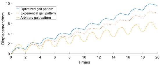 Some previous research [6,7,9,29] demonstrates the fact that multi-soft-modules can make a straight motion and turning motion by intermittent contact and friction with the ground, and our soft modular robot also takes the advantage of the method. The different phaseoffset of each module leads to an asynchronous contraction and expansion law, which realizes their intermittent contact with the ground surface. Therefore, the phaseoffset was set to be the genotype in our evolutionary algorithm, and the locomotion distance within the set time was set as fitness. The principle of the evolutionary algorithm was described in previous research [30], and a simple description is made here. When the algorithm is initialized, a set of random values is set for the genotype of each individual in the initial population. The soft robots in the initial population use this set of random control parameters to move at the same time, and the displacement during the set time represents the speed of the robots. The displacement can be measured by VOXCAD and read by the evolutionary algorithm as the evaluation index of the algorithm. Individuals with poor performance are eliminated, while individuals with excellent performance can be preserved into the next generation, and the genotypes of these individuals cross and regroup to produce other individuals of this generation. As a result, the overall performance of the population gets better and better. In order to improve the search ability of the algorithm, the random mutation is also set for the individuals. Such a process iterates multiple times until the set number of iterations is reached. Our algorithm was run for 500 generations with a population size of 150. The genotype of the individual with the best motion ability in the final population is selected as the control parameters of the actual soft robot, and this set of parameters was transmitted to Arduino via serial to control the on–off time of the solenoid valve set so as to control the deformation sequence of the soft cubes. Figure 8 shows three displacement curves exported by VOXCAD when using three different gaits of worm configuration (Please see more details in the next section). The optimized gait pattern was calculated by an evolutionary algorithm. In the experiential gait pattern, the five soft cubes are actuated in sequence, just like a real worm. The arbitrary gait pattern was actuated by a set of arbitrary control parameters. It can be seen from the displacement curve that the gait pattern calculated by our evolutionary algorithm has outstanding performance.