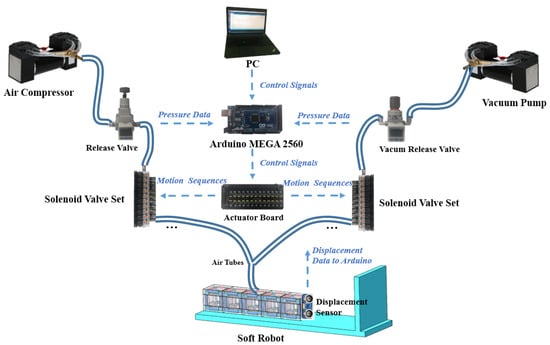 As shown in Figure 9, we used Arduino Mega 2560 as a controller to receive displacement data and transmit control signals from the PC to the actuator board of the solenoid valve set. The model of the solenoid valves was T103U-FL from OST Ltd., Taizhou, China. We used an air compressor and a vacuum pump to inflate and deflate the soft cubes. The pumps’ model was 15085VED24 from PENGPU Ltd., Shanghai, China. In order to ensure that the output pressure of the air compressor and the vacuum pump was constant, we set up the release valve and the vacuum release valve in the gas circuit. The model of the release valve was IR2010-02-A from SMC, Tokyo, Japan, and the model of the vacuum release valve was IRV10-LC06BZN from SMC. We used an ultrasonic displacement sensor of which model is HC-SR04 to measure the deformation and displacement of the soft robot.