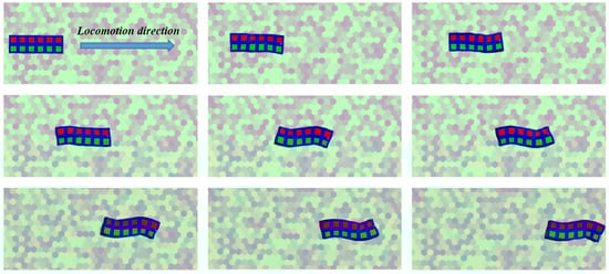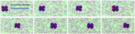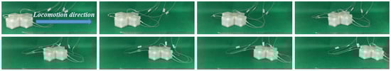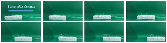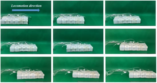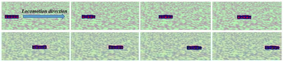 We selected three typical configurations to present the motion ability of the soft modular robot in the experiment condition and simulation software, which are the worm motion form, snake motion form, and quadruped-like motion form. In particular, it was notable that the green voxels in the snake configuration held the same physical characteristics as the red voxels, but had an opposite phase. Figure 10, Figure 11, Figure 12, Figure 13, Figure 14 and Figure 15 are screenshots from a fixed angle of view, and the direction of locomotion is shown in the Figures. It can be seen that the motion performance of the robots in the simulation software is approximately consistent with that in the experiment condition.