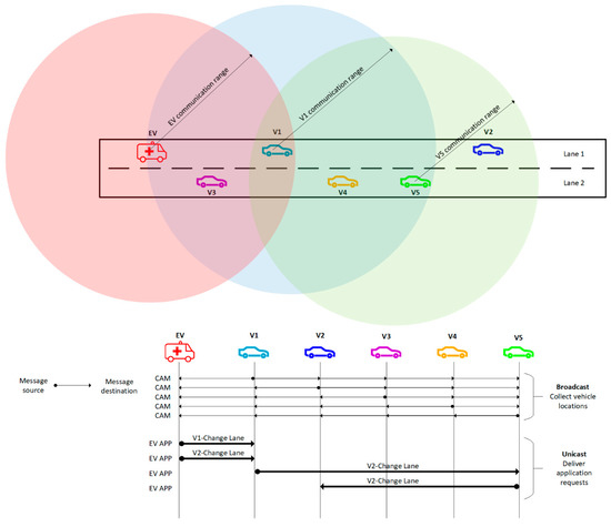 As communication between vehicles in VANET does not use acknowledgments, a sender does not have the information about the transmission result. Even if some messages may get lost the vehicles still have to be informed about the approaching EV. When the EV needs to communicate a request to a vehicle, it generates messages periodically with a specific interval ∆t. The generation of messages continues until the EV detects the desired change in the vehicle’s trajectory. When the vehicle again obstructs the EV’s trajectory, this behavior is detected, and the communication loop is initiated again.