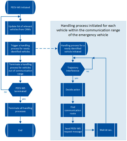 In VANETs, the EV receives the CAMs [36] from other vehicles within its communication range. From the received data, the EV learns a topology of the network and extracts the information about other vehicles’ locations and compiles a list of all reachable vehicles (see Figure 2). When the PEEV-WS is initiated, the main process executing the steps illustrated in Figure 3 is triggered. The main process updates the list of relevant vehicles based on CAMs. For each newly identified relevant vehicle, a communication handling process is triggered, and the communication process with already irrelevant vehicles is terminated. When an interference between EV trajectory and a vehicle is detected in the communication handling process, the corresponding warning message is created, and a routing protocol is used to find a communication route to the interfering vehicle (see Figure 3). This ensures that only the relevant vehicle receives the information about the approaching EV together with the specific request for the desired action. In general, to decide on a suitable action is a very complex problem and it is out of the scope of this paper. In simulations, we consider scenarios involving multiple lanes and the action is limited to changing lanes to one which is not interfering with the EV trajectory.