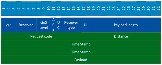 The structure of the message was designed to accommodate all information required for the correct operation of the system (see Figure 4). Blue fields represent the message header while green fields are the system payload. The length of the payload field was chosen to allow the stacking of multiple requests linked with the same destination. This approach helps to decrease wireless channel congestion by transferring multiple requests within a single medium access procedure at the MAC layer. Two timestamp fields in the payload were introduced to get a high precision timestamp of the message encapsulation. The 64 bits correspond to the resolution of one nanosecond. Based on this information, the receiving node can estimate the end-to-end delay of the corresponding transmission, while gaining information about the timeliness of the received message. The calculated end-to-end delay could also be used by the routing process at the network layer to fine-tune a next-hop selection. A detailed description of the remaining message format fields can be found in Table 2.