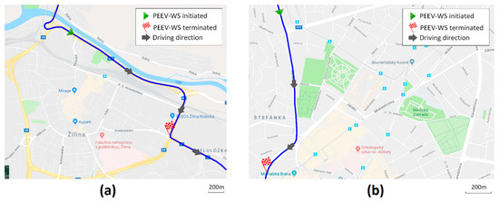 To investigate the performance of the proposed system thoroughly, two traffic scenarios were designed using a realistic model of the road infrastructure of two Slovak cities: Žilina and Bratislava. These two scenarios were selected as they represent a typical layout of urban road infrastructure, where the emergency lane can be implemented. The Žilina scenario consists of a road segment belonging to the city circle, which has a higher speed limit (70 km/h) and is a highway-like multilane road without intersections. The selected road segment is frequently used by ambulance vehicles as the main ambulance station in Žilina and the hospital are located close to the endpoint. The Bratislava scenario represents a typical dense urban network with many intersections and a low-speed limit (50 km/h). Hence, the scenarios were designed to study how different environments affect the system’s performance. The geometries of the road networks were extracted from the openstreetmap.org project [37] and can be compared in Figure 5. In all simulations, a sufficiently long initial phase was used to populate the road infrastructure with vehicles, before the EV entered the scene. The EV entered the simulation and started to transmit messages at the time .