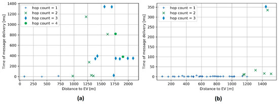 If the distance between the EV and vehicle was less than 1000 m, the time of the first message delivery was negligible as in most cases one hop was sufficient. When more hops were needed the delivery time increased, nevertheless, it did not exceed 1.5 s, which is an acceptable value, considering the required reaction time. The three vehicles in Figure 7a with times of message delivery greater than 1 s, correspond to the cases when the first sent message did not reach the destination vehicle and the message was retransmitted during the following time interval.