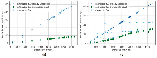 The available reaction time as a function of the distance between the EV and the vehicle, in (a) the Žilina scenario and in (b) the Bratislava scenario.