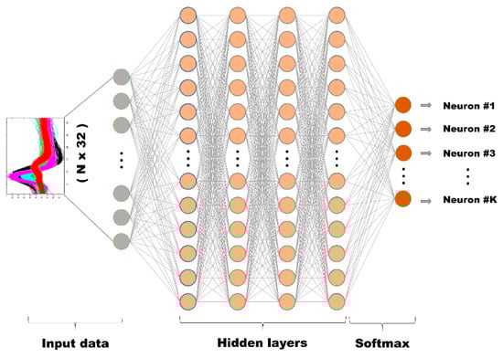 For our model, the input layer is a 32-dimensional layer where each dimension corresponds to the 32 sampling points of the data. As for the hidden layers, four cascades of layers each with 256 nodes were used. The number of layers and nodes for each layer were chosen heuristically since there are no known analytical methods for obtaining such parameters [35]. As for the activation function, we have used hyperbolic tangent function for the hidden layers, while for the output layer, which reduces dimension to equal classification categories and gives classification probability of each classification category, Softmax (1) activation function is applied so that the probability sum is equals to 1: