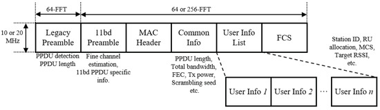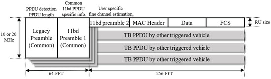 In the proposed scheme, we assume that the PPDU structure of TB PPDU and the PPDU for TF transmission for IEEE 802.11bd VSTAs follow the format of HE TB and HE SU PPDU defined in the IEEE 802.11ax standard, except that the subcarrier spacing is halved with increased OFDM symbol duration. Following the assumption, a triggering station can schedule up to 9 stations per single 10MHz bandwidth using the smallest RU size with 26 OFDM tones. In this paper, multi-channel transmission in [34] is not considered. The general format of the proposed TB PPDU is depicted in Figure 2.