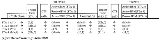 Since broadcast BSM is destined to all nearby VSTAs, all VSTAs within the transmission range of each transmitting VSTAs needs to be protected. Thus, in the proposed scheme, a protection procedure using MU-RTS is proceeded ahead of multi-vehicle BSM transmission. Since the MU-RTS protection in DTA is always intended to all neighboring VSTAs, the Common Info field can contain all the necessary information for MU-RTS procedure without User Info List field. Furthermore, as the Common Info field information of the MU-RTS frame can be reused for the TF soliciting TB PPDU transmission of BSM, the TF for MU-RTS procedure and that for multi-vehicle BSM triggering can be merged into one unified TF. Thus, once a triggering VSTA transmits a TF, all VSTAs that receive the TF transmit simultaneous CTS immediately after the TF reception, following that a simultaneous TB PPDU transmission is made by the scheduled VSTAs. Within the User Info List field of the TF, RU scheduling information for multi-vehicle BSM transmission is included, and the triggering VSTA reserves one of the scheduled RUs for the BSM transmission of itself. If the triggering VSTA does not receive any CTS frame in response to the TF, the VSTA considers the TF transmission has failed and invokes another backoff procedure. In this case, however, the VSTA does not change the current contention window size as the previous backoff procedure was invoked by a broadcast frame. An example of the proposed DTA transmission sequence is described in Figure 3.