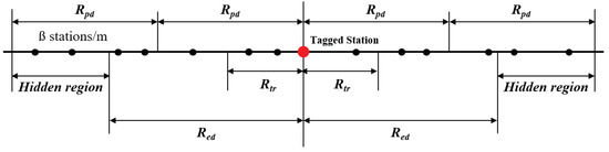 Regarding the relationship between the radio range and transmission power, we apply the same approach as described in [24]. Assuming all VSTAs have the same transmission power and receiver sensitivity, the ED range of a transmission, , is greater than the PD range, . By assuming the interference range greater than and less than , the VSTAs within the region , become hidden VSTAs of which the transmission might cause an interference to the tagged VSTAs if the transmission duration is overlapped to each other.
