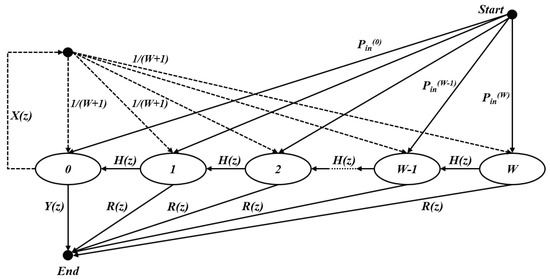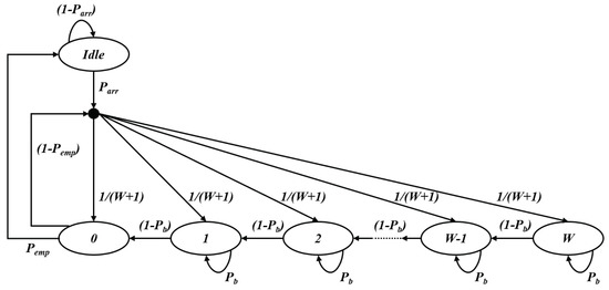 According to the IEEE 802.11 standard, broadcast frames, such as BSM, do not require an acknowledgement from the recipients, so the transmitter cannot determine whether the transmission has succeeded or not. As there is no change on the contention window size of the transmitter, the EDCA procedure with the fixed contention windows size, W, can be modeled as one-dimensional Markov chain model as depicted in Figure 5 [38]. In Figure 5, , and denote the probability of a packet arrival from the higher layer during a virtual time slot [39], , the probability that no active BSM exists in the queue and the backoff blocking probability [40], respectively.