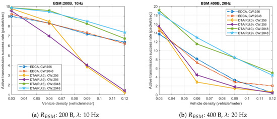 Figure 7 shows the active BSM transmission success rate of the proposed scheme that a BSM is transmitted and delivered to all receivers within the PD range. According to the figure, DTA always shows better performance than the legacy 802.11p EDCA scheme as long as the contention window size and the number of scheduled RUs per transmission is large enough. In case of low vehicle density, the proposed scheme guarantees successful delivery for greater than 90% of the generated BSMs, and in the most extreme case, high vehicle density (0.12) and heavy data traffic (: 400 B, : 20 Hz), DTA successfully transmits more than 20% of the generated BSMs improving the transmission success rate by twice of EDCA performance.