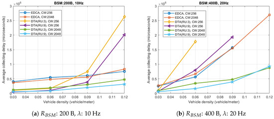 The figure proves that our proposed scheme deals with heavy congestion very well. It is observed that the collecting delay of EDCA scheme increases drastically as the vehicle density increases for heavy traffic case, and the maximum difference of the collecting delay between the moderate traffic case (Figure 8a) and the heavy traffic case (Figure 8b) reaches to 1.9 s. On the other hand, the maximum difference of the proposed scheme remains less than 0.7 s when the contention window size is sufficiently high.