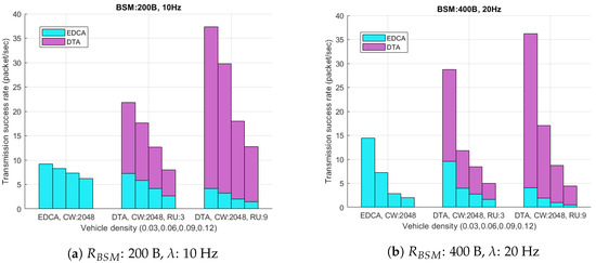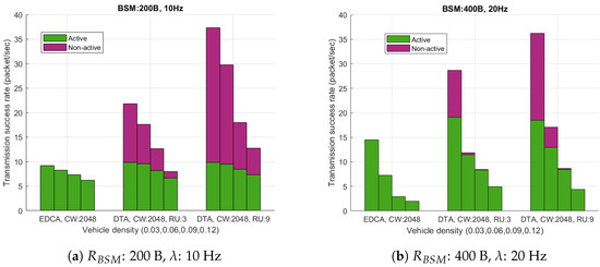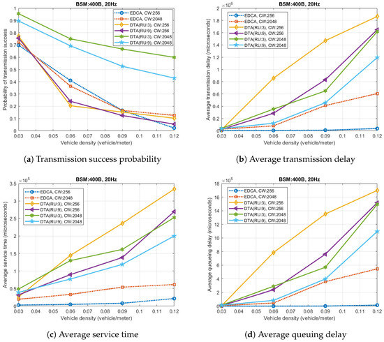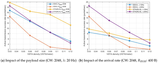 Figure 12 shows the performance impact of the payload size and the arrival rate. Figure 12a depicts the transmission success rate of active BSM with variable payload size. According to the figure, with greater payload size (: 400 B), DTA always outperforms EDCA, and the performance gap increases as the vehicle density increases. The result shows that DTA with greater payload size (: 400 B) has almost same performance as EDCA with smaller payload size (: 200 B).