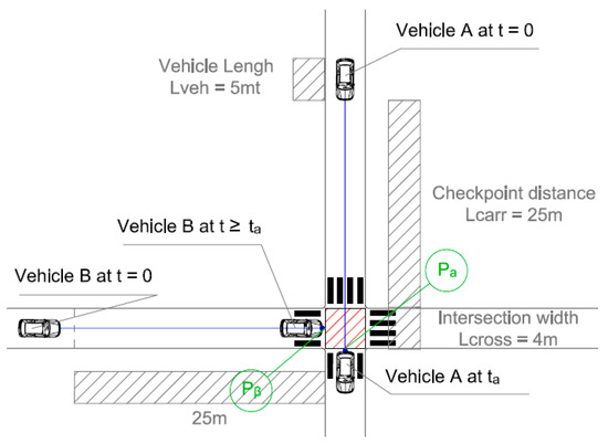 Vehicle A, assuming it moves at constant speed, will arrive at point PA at the time ; where SA is the distance between the vehicle and the PA point (assuming the distance of the checkpoint from the intersection of 25 m [Lcarr], the width of the intersection equal to 4 m [Lcross] and the length of the vehicle equal to 5 m Lveh)