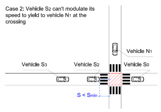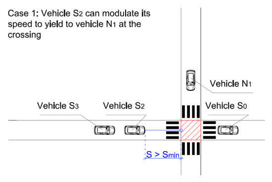 In Figure 2, for example, the priority will be the following [N0, S1, S2, N3, …] so the vehicle S1 will adapt its speed according to the vehicle N0, the vehicle S2 will adapt its speed only to guarantee the minimum distance of safety from S1, the vehicle N3 will adjust its speed so as to arrive at the intersection at the moment when S2 will arrive at the end of the intersection and so on.