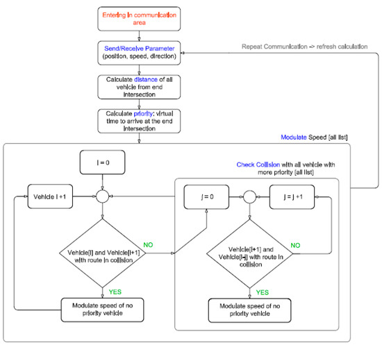 Therefore, all possible collisions in the possible routes must be detected, in this case 12, and then manage the regulation state according to the fact that the two consecutive priority vehicles can have collisions or not. In the event of a possible collision we will adjust the speed of consecutive vehicles. Otherwise the vehicles will safely cross the intersection without any adjustment. Figure 10 follows the block diagram of the implemented system.