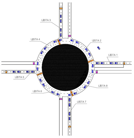 The principle remains the same, but in this case we have to manage 4 different intersections. Referring to the figure, the vehicles of list 1 and list 8 will have to work together to form list 2. It will take into account both the presence of vehicles that will exit the roundabout before meeting the vehicles on list 1 and the lanes to be occupied according to path that you will have to follow. The vehicles ready to exit the roundabout will occupy the most external lane, the others the internal one. In the same way the vehicles of the list 2 will collaborate with those of the list 3 and so on. The optimization of the roundabout certainly has as main objective to dispose as quickly as possible the cars already inside the same. In fact, faster entry into disposal will lead to an inevitable saturation with a consequent slowing down of the vehicles involved. As we will see later, from the simulations performed, the use of roundabouts is not suitable for optimizing travel time in the presence of driverless vehicles.