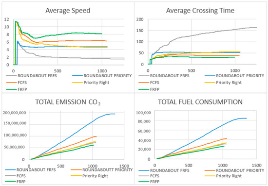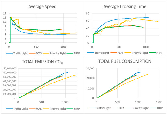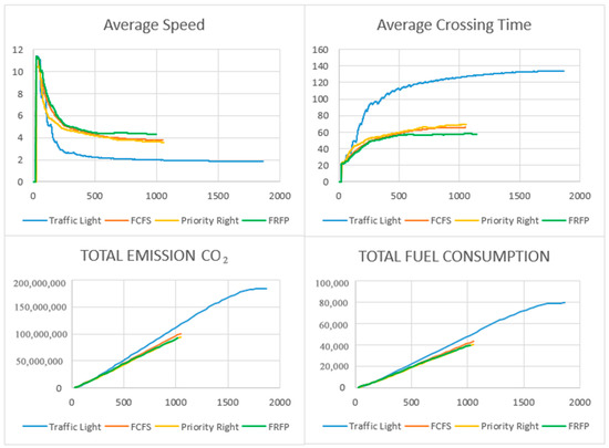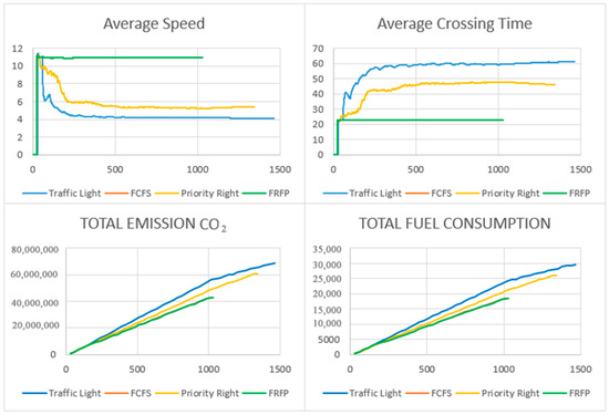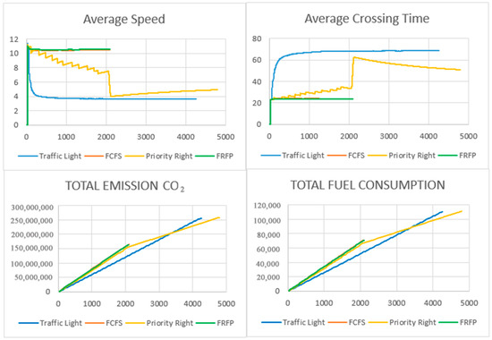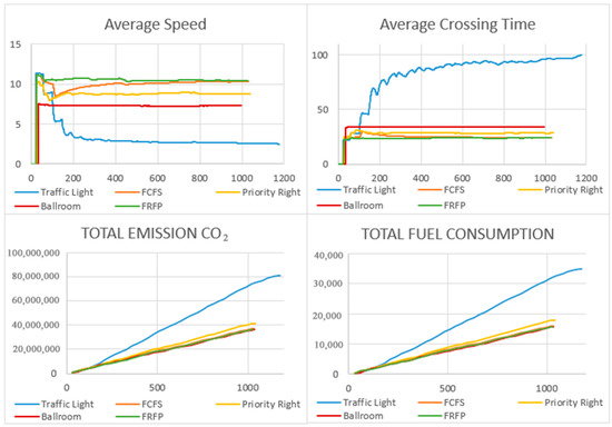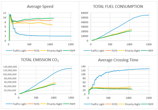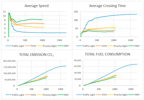 Case 2 (3450 Vehicles/H)): Also in this case, with a congestion considerably higher than the previous case, as we can see from the results, the algorithm developed (FRFS) presents considerably higher performances comparing it to the classic traffic light system and they are little better than the FCFS system (Figure 14). The FRFS system shows (Table 2) a 173.3% increase in average speed compared to the traffic light system and 0.8% compared to the FCFS system. As shown in the table above, it exhibits better performance also in terms of average transit time, emissions and fuel consumption.