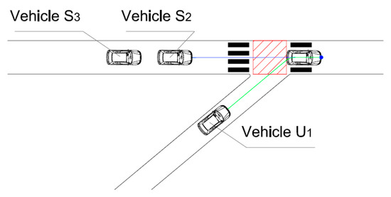 Figure 6 shows the case of the on-ramp intersection. In this case, the different vehicle trajectories must be considered to arrive at the end of the intersection. In general, vehicles coming from the low lane must travel a greater distance to reach the end of the crossing. Therefore, in the formulas previously presented, the relative distances between the vehicles and the end intersection must be entered considering the trajectories that the vehicles will carry out.