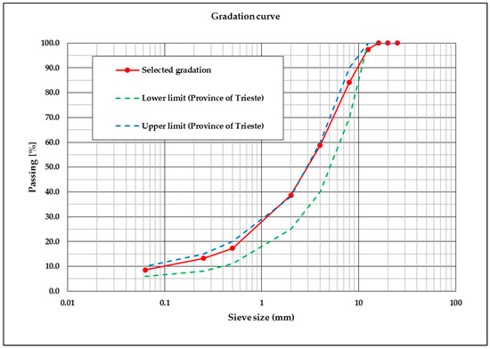 All the selected sites presented suitable features to preserve homogeneity among field measurements. All the sites were part of the road network of the Province of Trieste; they were located in the road tangent and belong to two-lane rural roads. The roadway cross sections were almost the same (Table 2) and, obviously, the wearing course had been built using the same mix design (Table 3) and aggregates gradation (Figure 5), and the type of slag and limestone was the same as that used for laboratory experimentation. In addition, traffic conditions were substantially the same for each site. The heavy traffic was almost exclusively composed of local public transportation vehicles.