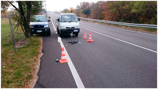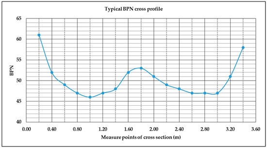 Given that the type of test that allowed us to determine the value of skid resistance at a single point, a procedure that evaluates the value of BPN, according to the standard UNI EN 13036-4 [16], which can be representative of a stretch of road, had to be adopted. Before executing the measurements, the local variation in the value of the BPN was investigated in the transverse direction of the road. In particular, the distribution of the value of the BPN at several transverse points along several sections was analyzed in order to accurately identify the predominant wheel paths (Figure 7).