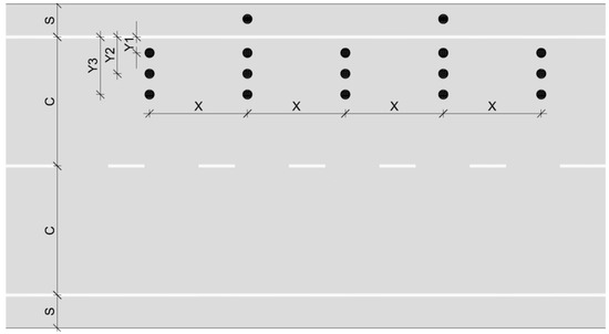 It was possible to exactly define the measurement points from the analysis of the experimentally derived transverse distribution of the BPN. More specifically, three points were chosen for each investigated section at different distances from the margin line (Y1 = 0.60, Y2 = 0.85 and Y3 = 1.10 m), in order to select the minimum reference value (Figure 8). In addition, for each site, measurements were carried out in correspondence with five distinct sections, arranged at a distance (X) of 10 m from one another. Ultimately, for each site the measurements were conducted at 15 distinct points.