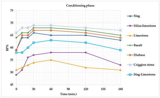 The results of the conditioning phase in the polishing test are shown in Figure 9. The BPN reported are the averages of the values of four specimens for each aggregate using the normal PSV scale for the small slider, without any correction. The trend of the values is in accordance with what normally occurs in these tests, with an initial increase, due to the removal of the residues of the resin used for the realization of the samples, followed by a decay of the values due to the initial wearing.