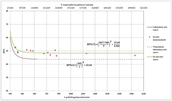 In Figure 11, the continuous line features the degradation model of the aggregate mixture used in the wearing course, identified in the laboratory (Table 4 and Table 5), with the addition of a coefficient k, which takes into account the different procedures of polishing at the site. The same graph, with a change of values on the x-axis, illustrates the values of the experimentally measured BPN as a function of traffic. Using an equivalence factor between the polishing time and the traffic, according to the following expression, an adequate interpolation of the experimental data was found (Table 8):
