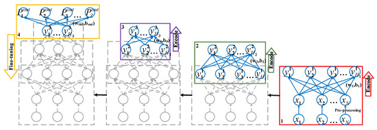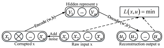 An SDAE is stacked by multiple denoising autoencoders (DAEs) as hidden layers. Each DAE layer is used to train the pair of encoder-decoders to make the output value equal to the input value as much as possible. If input data can be restored after encoding and decoding, then the feature representations trained in this way will contain relatively low noise levels. Figure 2 shows the process of a DAE. The encoder-decoder can be formulated as